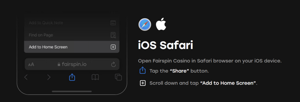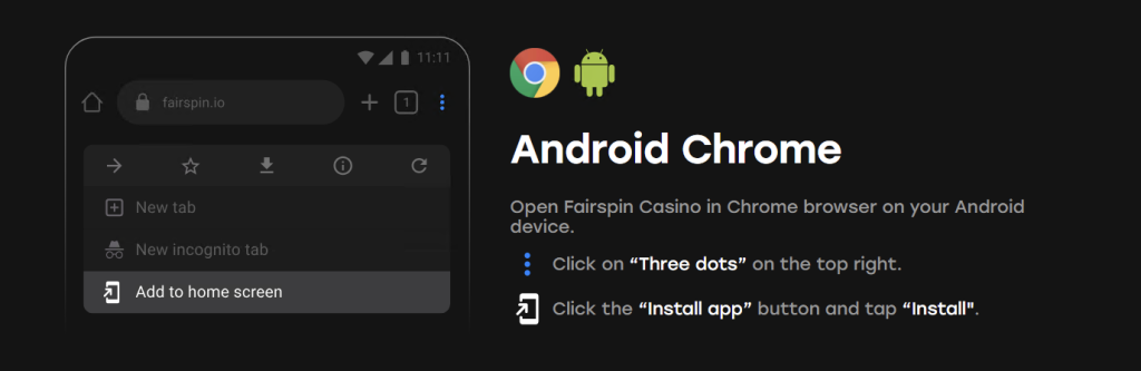 D’Installatioun op Android ass ganz einfach. Maacht de Chrome-Browser op a gitt op dĂ©i offiziell Websäit vu Fairspin. Wann d’Säit gelueden ass, drĂ©ckt op dĂ©i dräi vertikal Punkte uewen an der rietser Eck vum Browser. Am MenĂĽ, deen erschĂ©ngt, wielt Dir “App installĂ©ieren” oder “Zum Startbildschierm derbäisetzen”. Bestätegt d’Wiel an der Pop-up-FĂ«nster. Elo gĂ«tt en Ikon fir Fairspin mobile op Ă„rem Startbildschierm erstallt, an Dir kĂ«nnt et genee wĂ©i all aner App benotzen, ouni iwwer de Google Play Store ze goen.
